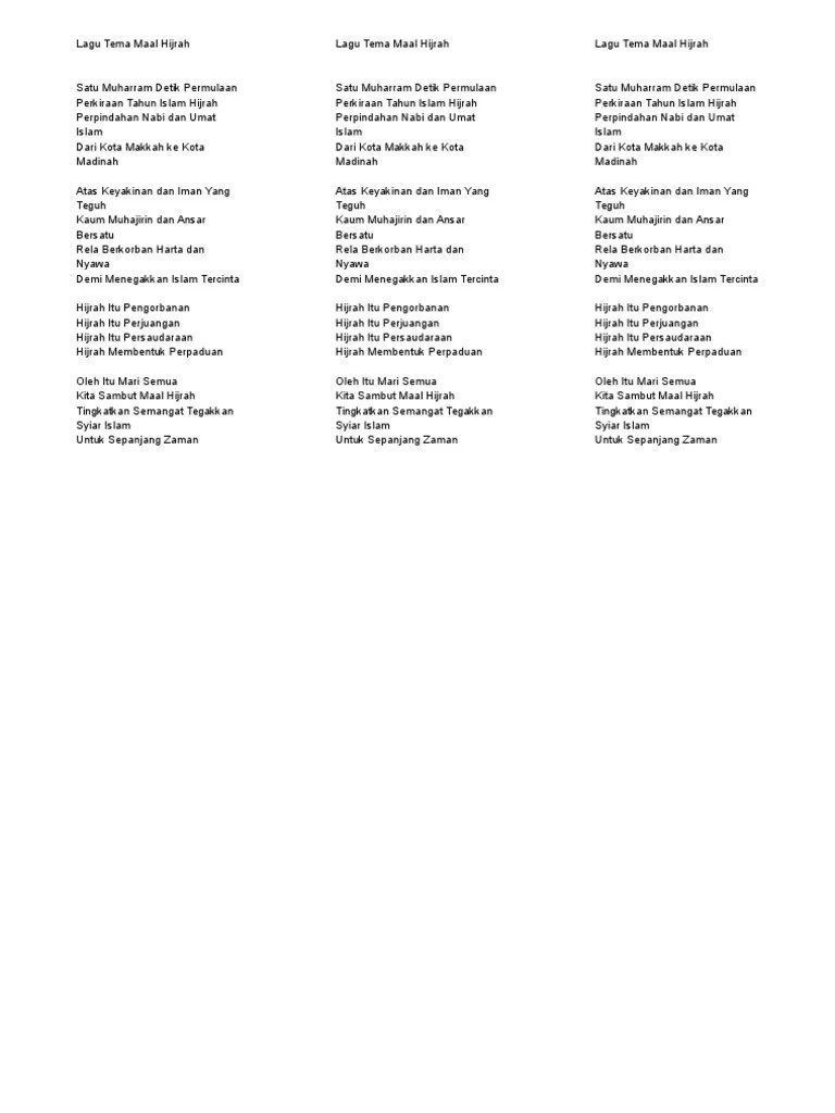 Maal hijrahsatu muharam detik permulaanperkiraan tahun islam hijrahperpindahan nabi dan umat islamdari kota mekah ke kota madinahatas . Terkenang zaman sekolah rendah dulu. Lirik lagu maal hijrah (1 muharram) al ajiba. Serious lagu maal hijrah ni sampai sekarang rasa bersemangat bila dengar.